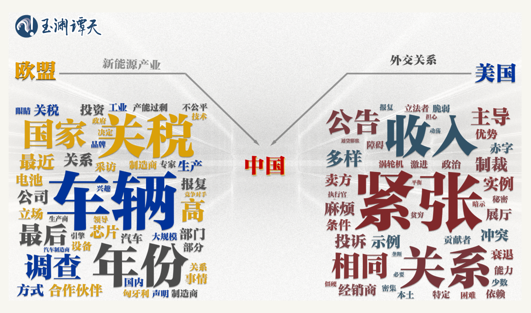 可以看到,以“车辆”“部门”“公司”“制造”等词为代表的关键词,都指向了新能源行业。相比之下,美国媒体对同一话题的讨论,更侧重“紧张”“关系”“冲突”“政治”等指向外交关系的关键词。