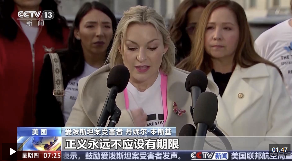 爱泼斯坦案受害者丹妮尔·本斯基:我们需要正视幸存者的遭遇,正义永远不应设有期限。司法部必须履行自身职责,向我们公开剩余的相关文件,即刻启动相关调查工作,立即调查文件中所载事项。