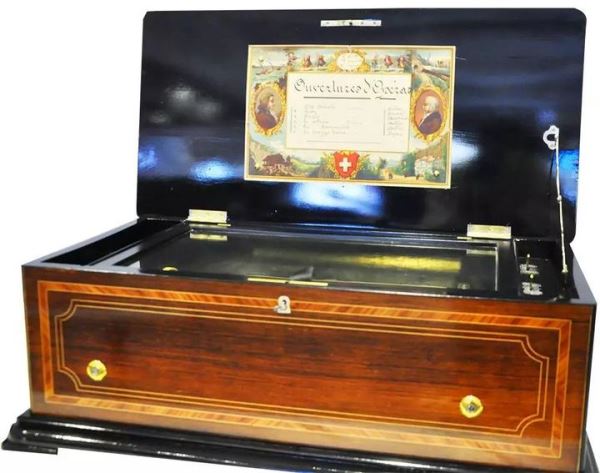 大约产于1900年左右的原装Polyphon唱片音乐盒。它包括一个带有图案的盖子,展示了城堡的风景。表壳为胡桃木贴面。 盖子上装饰有细线和花朵镶嵌物以及轮廓条。 音乐板尺寸为36厘米。它有一把梳子和12个铃铛。 它的状态极佳,并且是一个在线搜索量很高的音乐盒。