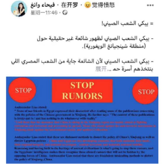 王馨:“朋友,我知道最近网络上有很多抹黑中国新疆政策的帖子。但只要你留心一下,就能发现很多图片是假的。你们很难看到有关新疆的正面新闻。如此密集地出现污蔑新疆的帖子,这肯定是有人蓄意而为的,就像‘阿拉伯之春’一样。在这种时刻,同为发展中国家并具有良好传统友谊的埃及,更应该与中国互利合作,携手共进,为提高两国人民生活水平而努力。”