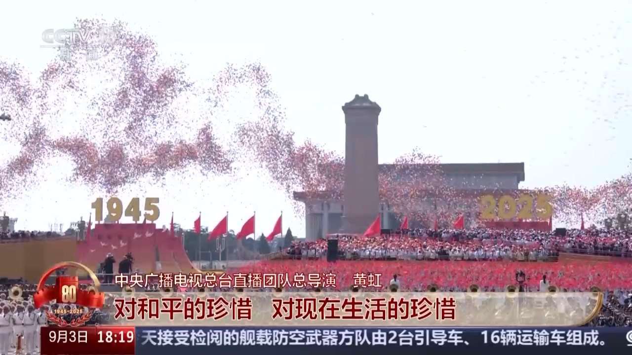 中央广播电视总台直播团队总导演黄虹:我们更多是希望能够通过这种庄严隆重、大气豪迈的镜头表达,来表达出中国人对抗战胜利这件事情的铭记,也希望能够在这个过程当中,来表达出中国人对和平的向往、对和平的珍惜、对现在生活的珍惜。