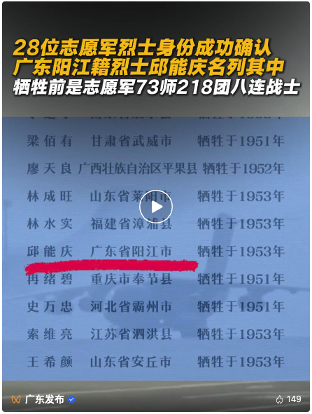 1953年7月10日,邱能庆在战斗中壮烈牺牲。牺牲前,他是志愿军七十三师二一八团八连战士——这些具体信息来自阳江市退役军人事务局,老人只记得父亲说过,邱能庆的军功章有很多,送到家里来,村人才知道他在朝鲜牺牲了。“已经知道了他安葬的地方,以后有机会的话会去看看他。”