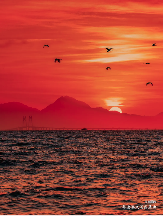 日出江花红似火。在摄影师@金瑶鸣的镜头里,这抹红从海平线底下“涌”出来,嚷嚷着要把黑夜推走。而这般热烈的红,恰似广东人的魂:对生活的热,对事业的闯,对未来的盼。