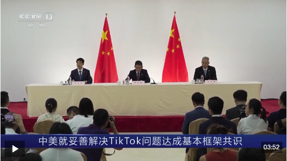 发布会上,中国国家互联网信息办公室副主任王京涛在回答媒体提问时指出,中美双方在充分尊重企业意愿和市场规律的基础上,就通过TikTok美国用户数据和内容安全业务委托运营、算法等知识产权使用权授权等方式解决TikTok问题,达成了基本共识。中国政府将依法审批TikTok所涉及的技术出口、知识产权使用权授权等事宜。
