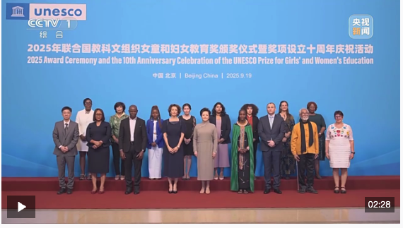 9月19日下午,2025年联合国教科文组织女童和妇女教育奖颁奖仪式暨奖项设立十周年庆祝活动在北京举行,国家主席习近平夫人、联合国教科文组织促进女童和妇女教育特使彭丽媛同联合国教科文组织总干事阿祖莱共同出席并致辞。