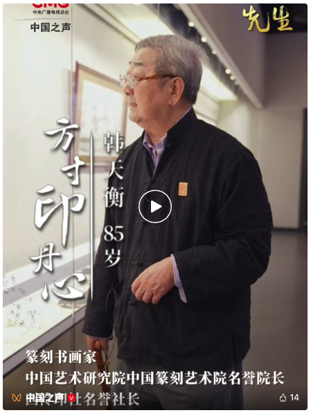 韩天衡,1940年5月出生于上海,今年85岁,当代篆刻书画家、中国艺术研究院中国篆刻艺术院名誉院长、西泠印社名誉社长、中国书法最高奖“兰亭奖”获得者。他的篆刻作品汲古出新,独树一帜的草篆入印、鸟虫篆印开一时风气,引领篆刻艺术现代化的潮流,入藏中国国家博物馆、大英博物馆等。他编著的《历代印学论文选》《中国印学年表》等著作,填补了印学研究领域多项空白。2024年,因其在篆刻、书法、绘画、艺术理论等多个领域的成就,被中国文联授予“终身成就奖”。