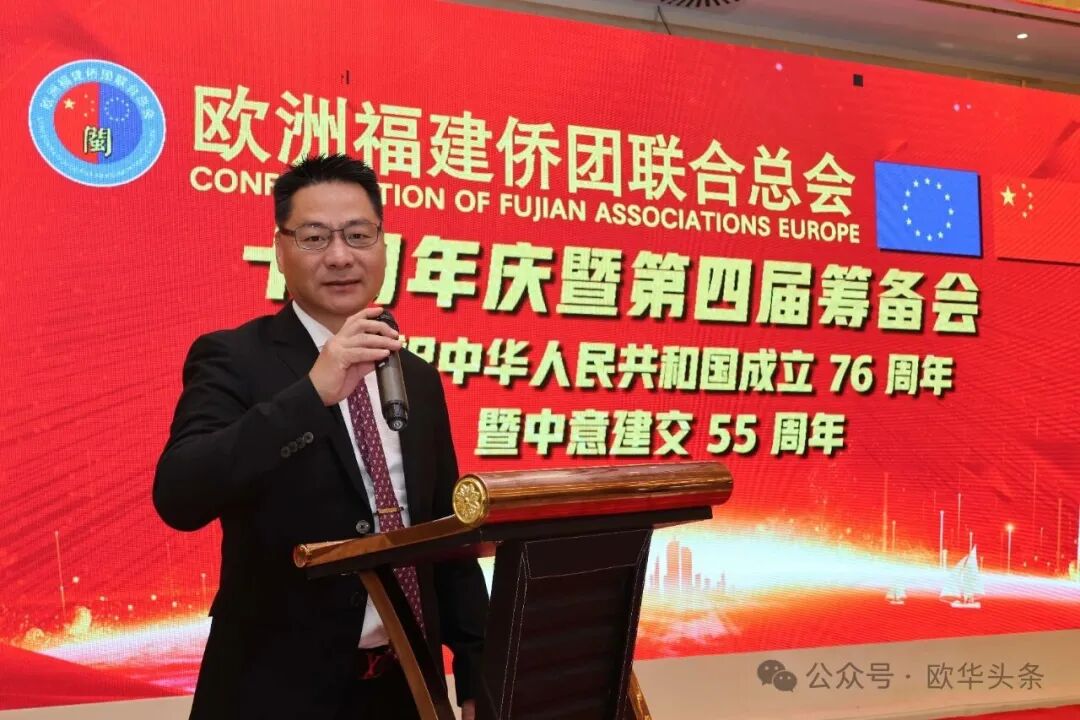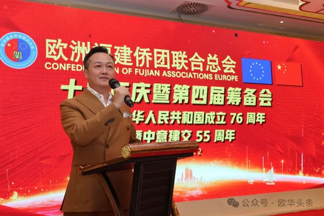 郑文华会长特别提到,去年11月,总会荣获“侨社之星”殊荣,这是对旅意福建侨胞多年团结奋斗、热心公益、情系桑梓的高度肯定。他衷心感谢中国驻佛罗伦萨总领事馆、兄弟侨团及家乡侨务部门的支持与指导,并表示未来将继续团结奋进、携手同行,增强侨社凝聚力,讲好福建故事,弘扬闽商精神,为中意友好和侨界发展贡献更大力量。最后,他预祝欧洲福建侨团联合总会十周年庆典圆满成功,并祝各位身体健康、事业兴旺、阖家幸福。