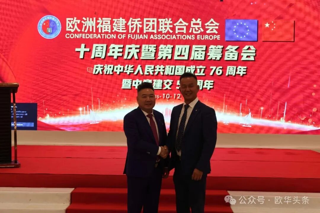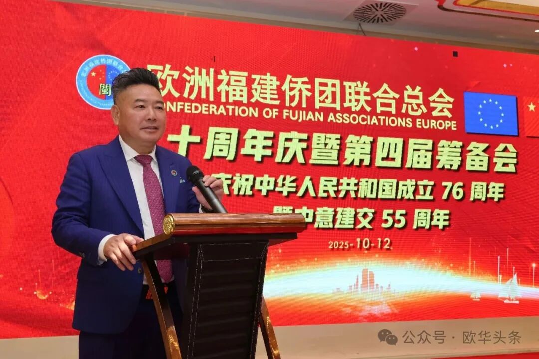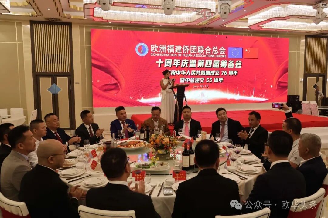 在庆祝中华人民共和国成立76周年,中意建交55周年之际,2025年10月12日晚,华灯璀璨。欧洲福建侨团联合总会十周年庆典暨第四届筹备会在意大利普拉托聚福酒店隆重举行。来自欧洲十多个国家及意大利各地区的上百位侨领和嘉宾欢聚一堂,共同见证这一具有里程碑意义的盛会。