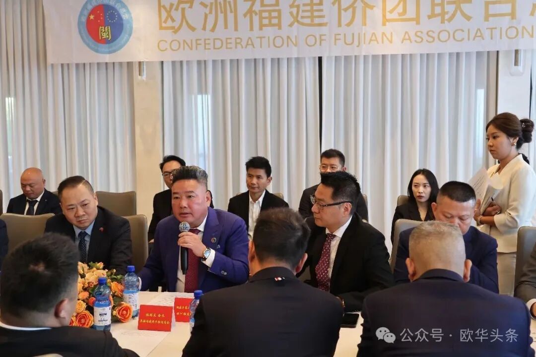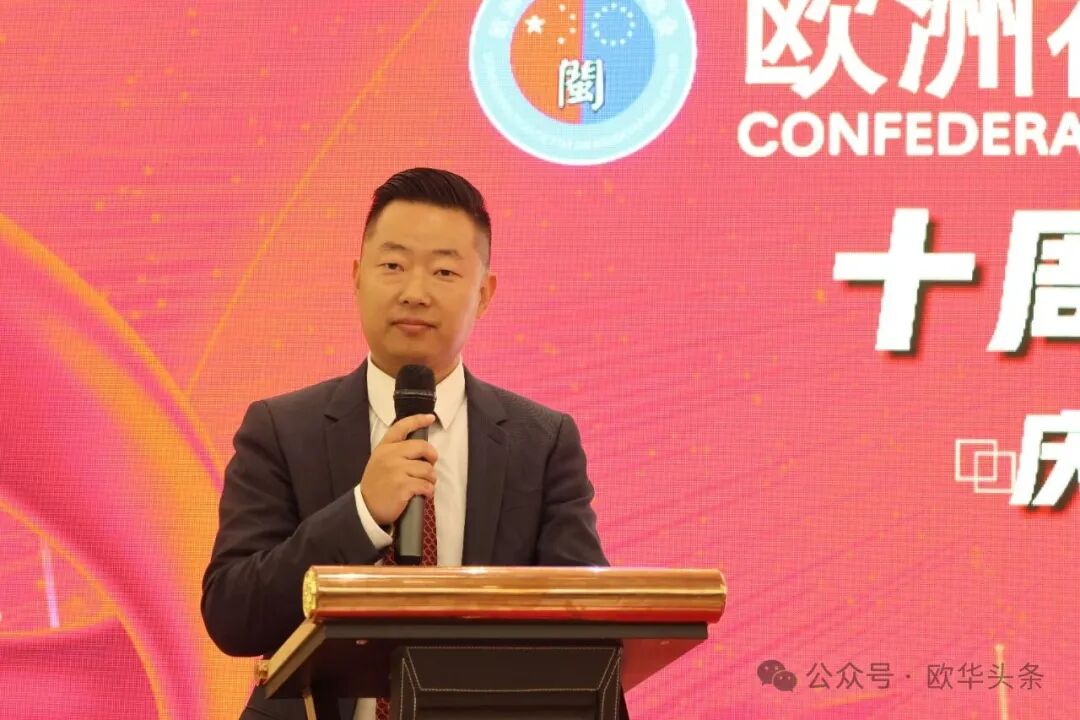 ▲欧洲福建侨团联合总会首届轮值主席陈云斌致辞。
