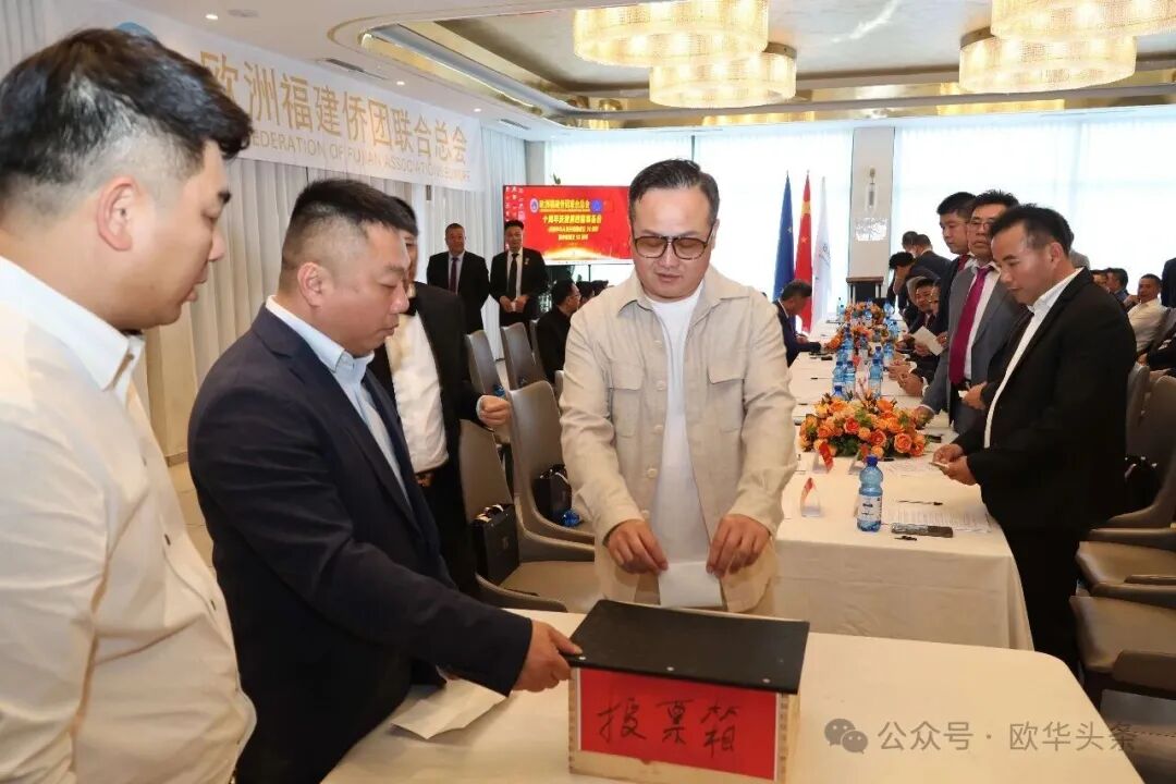 在公平、公正、公开的原则下,会议举行了欧洲福建侨团联合总会第四届轮值主席选举。现场设立监票人及计票人,全程监督与统计投票过程,确保选举公开透明、程序规范。共有31位主席亲临现场投票,另有3位主席通过委托书参与,共计34票。经无记名投票统计结果显示,胡建兵获以29票当选欧洲福建侨团联合总会第四届轮值主席。并经大会一致讨论决定,新一届换届庆典大会将于2025年12月中旬在福州隆重举行。
