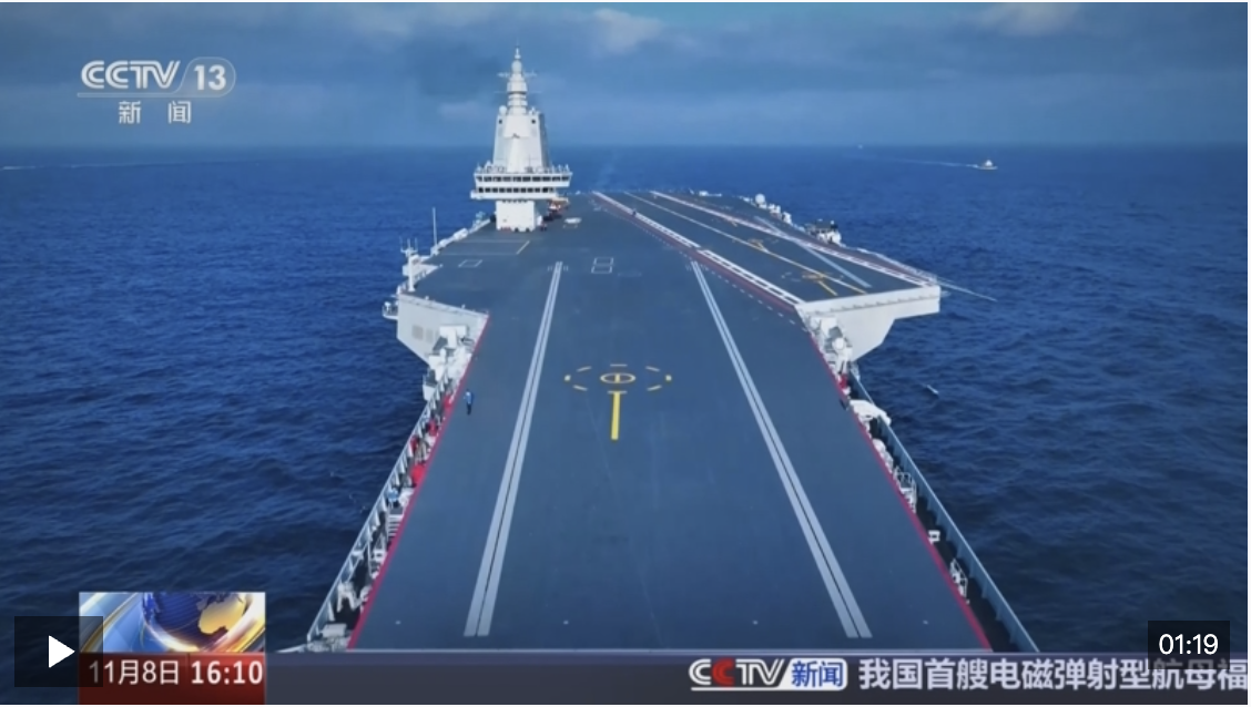 11月5日,我国第一艘电磁弹射型航空母舰福建舰在海南三亚某军港入列。8日下午,海军新闻发言人冷国伟就福建舰部署地点、舰载机配备和中国海军航母发展计划等问题,接受记者书面采访。