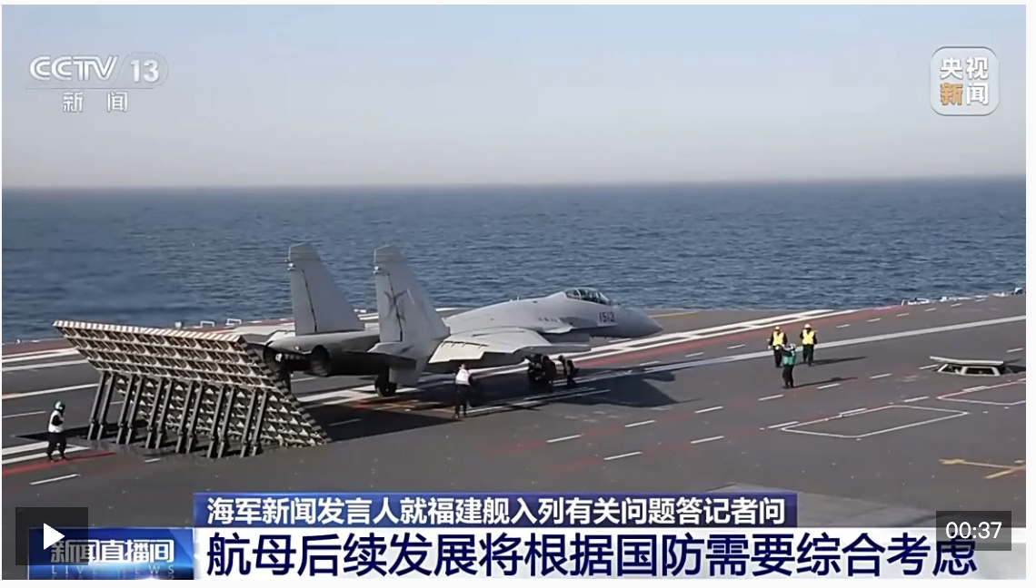 关于福建舰入列后是否还要继续开展试验试航,何时能够形成实战能力,冷国伟表示,福建舰是我国第一艘电磁弹射型航母,是海军转型建设跨越式发展的标志性装备,很多设备和技术都是第一次实际运用,入列后该舰将继续深入开展相关试验验证,进一步检验平台系统稳定性,同时将按计划安排舰机适配、编队体系训练等,不断强化实战能力。