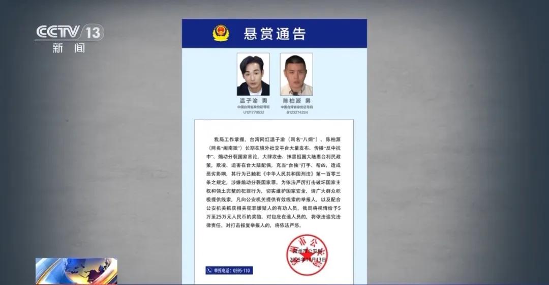 近日,福建省泉州市公安局发布悬赏通告,公开征集台湾网红温子渝(网名“八炯”)、陈柏源(网名“闽南狼”)涉嫌煽动分裂国家的违法犯罪线索。
