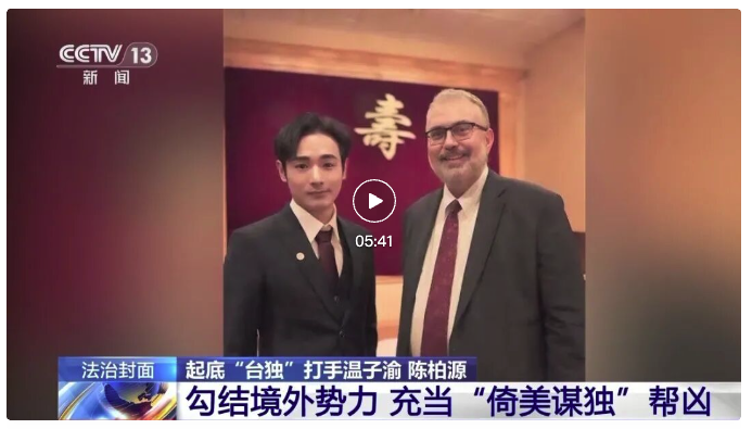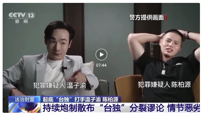 温子渝、陈柏源利用网红身份大肆抹黑大陆惠台利民政策、蛊惑未成年人发布反华言论、勾连境外敌对势力宣扬“抗中保台”;