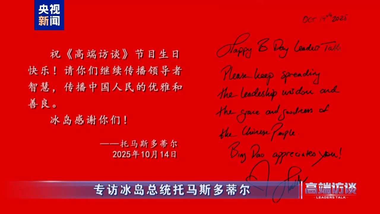 冰岛总统托马斯多蒂尔在接受总台专访后题词: