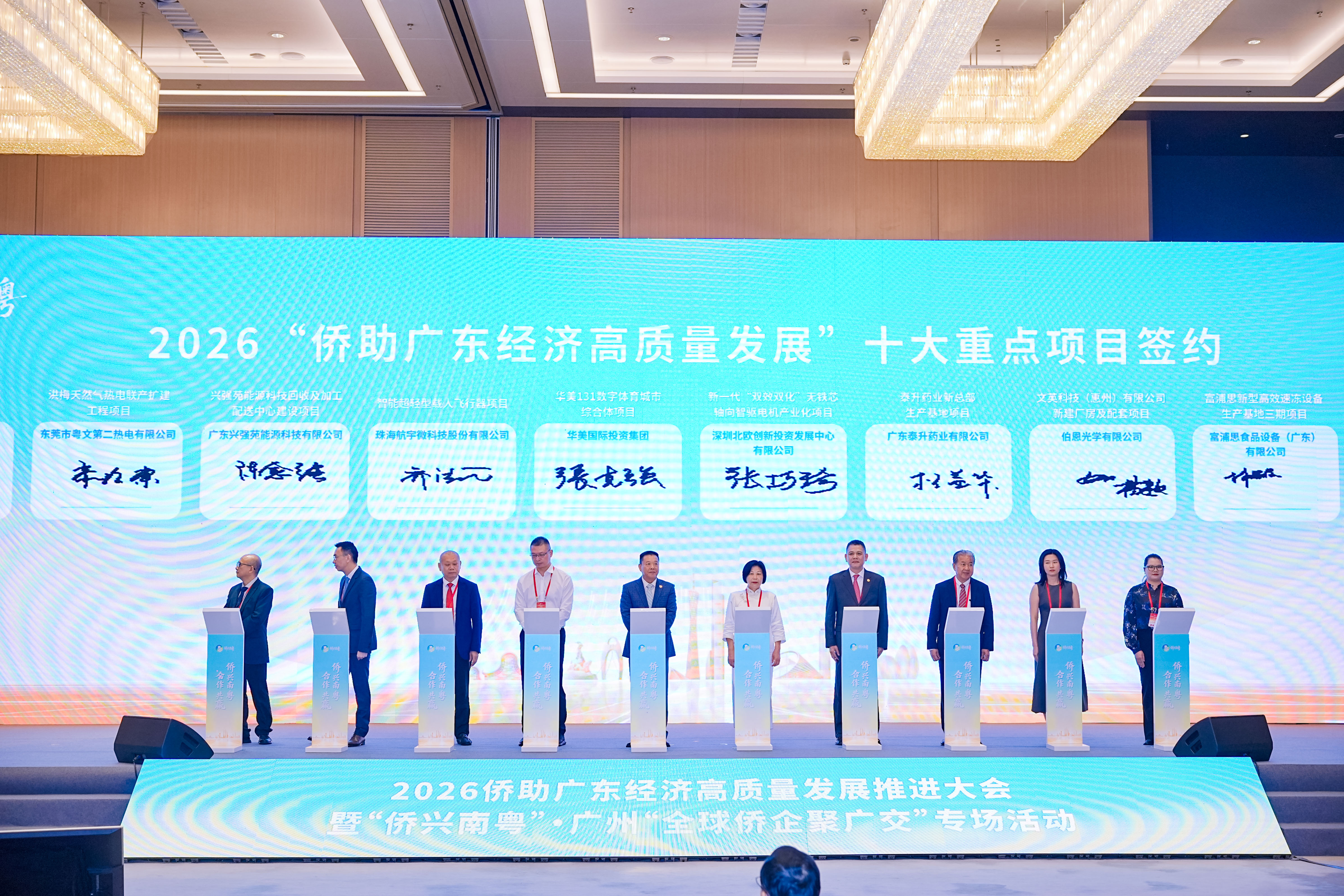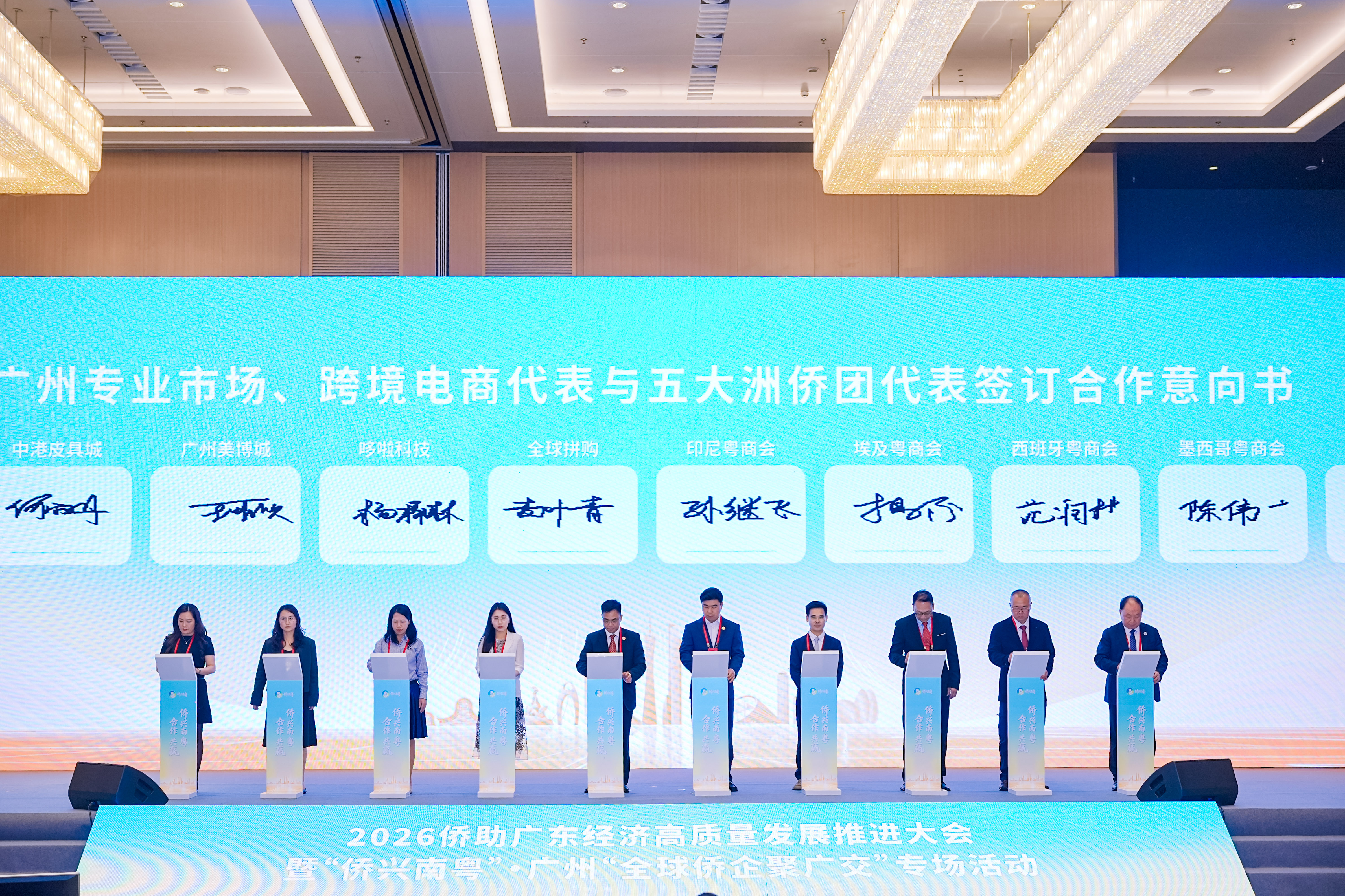 大会现场举行了2026“侨助广东经济高质量发展”十大重点项目签约仪式。此外,广州专业市场负责人与相关侨团代表签订合作意向书,广州跨境电商与海外侨团代表签订共建共享海外仓意向书。