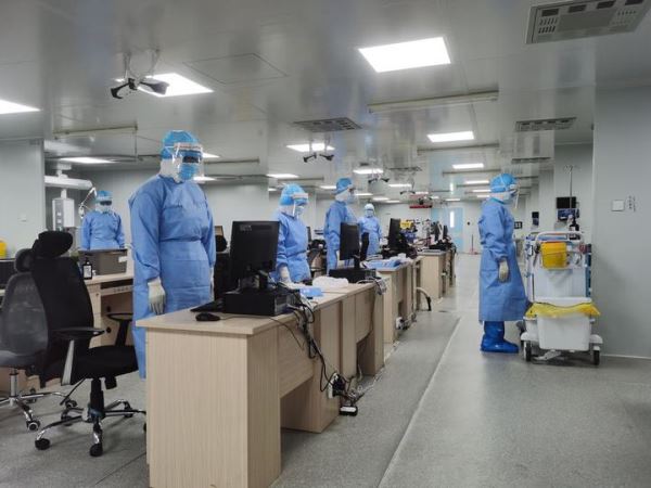Medical workers pay a silent tribute to martyrs who died in the fight against the novel coronavirus disease (COVID-19) outbreak and compatriots who died of the disease, at Huoshenshan Hospital in Wuhan, central China's Hubei Province, April 4, 2020. /Xinhua