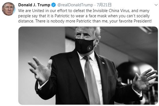 “many people say that it is Patriotic to wear a face mask when you can't socially distance," Trump tweeted on 21 July.