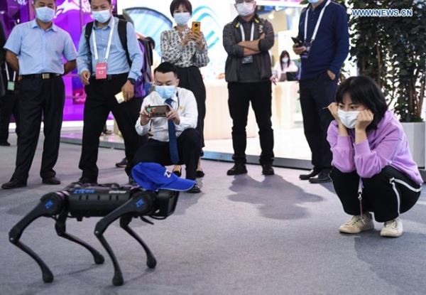 Visitors watch a robotic dog at a 5G-themed exhibition held during the World 5G Convention in Guangzhou, south China's Guangdong Province, Nov. 26, 2020. The 2020 World 5G Convention kicked off in Guangzhou Thursday, during which world-renowned infocom scientists, 5G service providers and 5G application adopters will exchange ideas on aspects of cutting-edge technologies, industrial development trends and innovative applications in 5G industry. (Xinhua/Deng Hua)