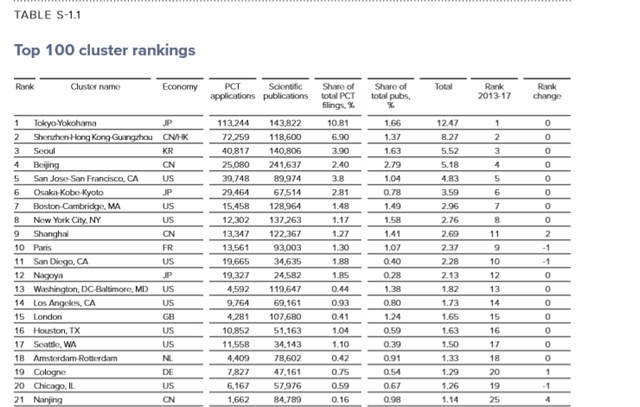 Top 100 cluster rankings (Screenshot from the ‘Special Section: Cluster Rankings” of GII, p. 44)