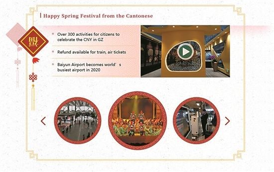 “云上岭南”文化博览会上线后引发海内外热烈传播效应,传播数据亮眼,境外落地捷报频传。新春佳节来临之际,“云上岭南”文化博览会联合广东省21个地市和主要区县、全球百家外媒,推出春节文化传播策划大行动“老广贺春——在线全球大联拜”,同步开设开放式专栏《老广贺春Happy Spring Festival from the Cantonese》,擂响在线贺春全球大联拜锣鼓。据悉,全球贺春大联播、大联拜活动将持续一个多月,推出主题系列策划融媒报道,精心策划春节文化短视频精品,选播广东主流媒体和各地市县区春节文化融媒报道、贺春短视频,全方位、多角度向全球展示岭南春节文化的独特魅力,让全球华侨华人和外国友人感受岭南新春的欢乐祥和,让中华春节文化走向世界。