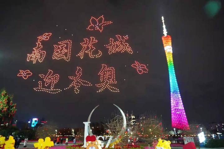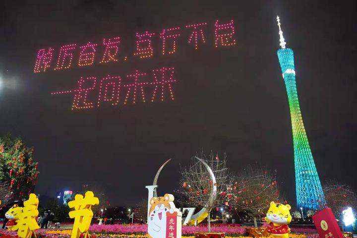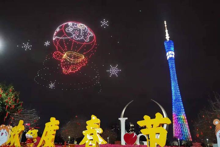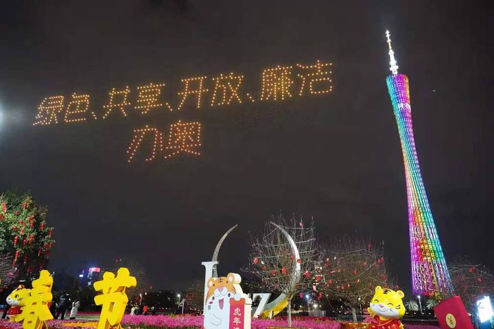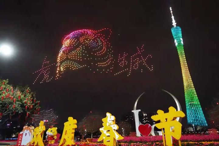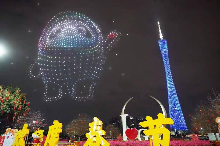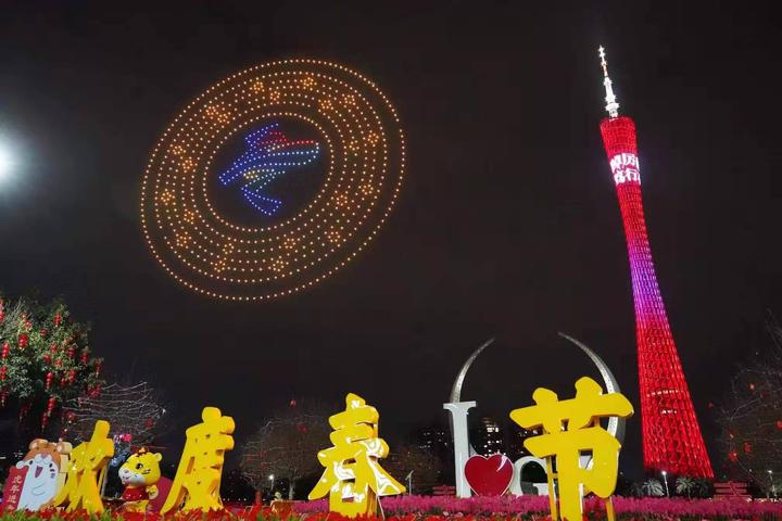 On January30,a drone show was held in Guangzhou,the capital of south China's Guangdong Province.More than1,000drones took to the skies to mark the start of the Chinese New Year and the Winter Olympics.In the night sky,the drones displayed the kapok,the city flower of Guangzhou,and the winter Olympics mascots‘Bing Dwen Dwen’and‘Shuey Rhon Rhon’,creating an attractive show.Check the video to explore a different Chinese New Year.