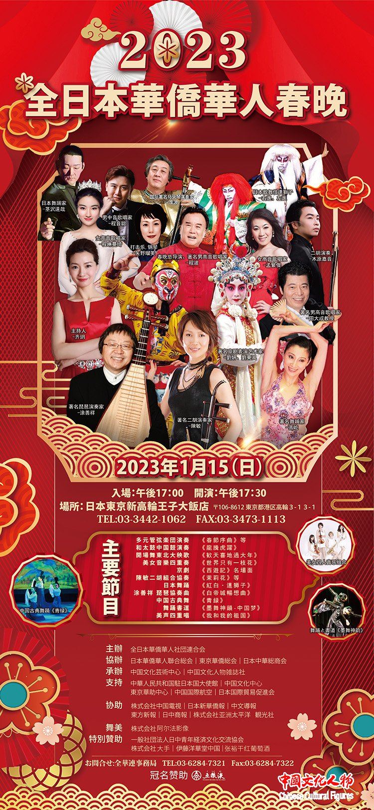 On January 15, 2023, “2023 Spring Festival Gala for All Overseas Chinese in Japan”, sponsored by All-Japan Federation of Overseas Chinese Associations, co-organized by Union of Overseas Chinese in Japan, Tokyo Association of Chinese Residents and Chinese Chamber of Commerce in Japan, organized by CICAC and Chinese Culture Figures Magazine, and supported by Embassy of the People's Republic of China in Japan and China Cultural Center, will be grandly held at the Grand Prince Hotel Shin Takanawa in Tokyo, Japan.