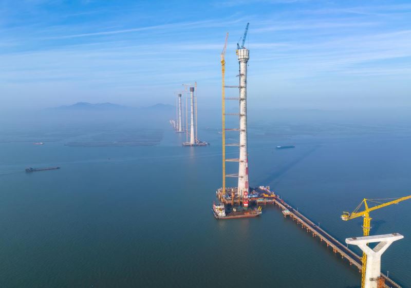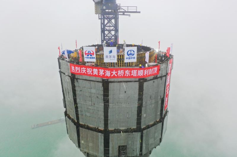 Three main towers–the east and west towers of Huangmao Sea Bridge and the west tower of Gaolan Port Bridge–have been erected.