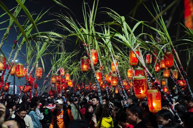 With the gong music playing in the background and lanterns shining high above the sugarcane, a traditional folk cultural activity titled "Sugarcane Lane" was held in Xikou village, Xiangqiao district, Chaozhou city on February 6.