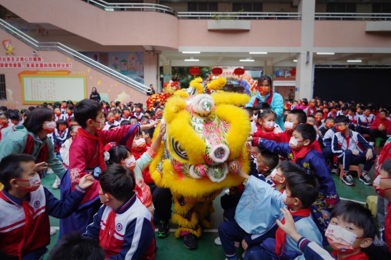 As the campus venue of the Guang Fu (Cantonese) Temple Fair, Guangzhou Zhuguang Road Primary School held traditional folk cultural activities such as lion dancing and lantern riddles guessing at the opening ceremony.