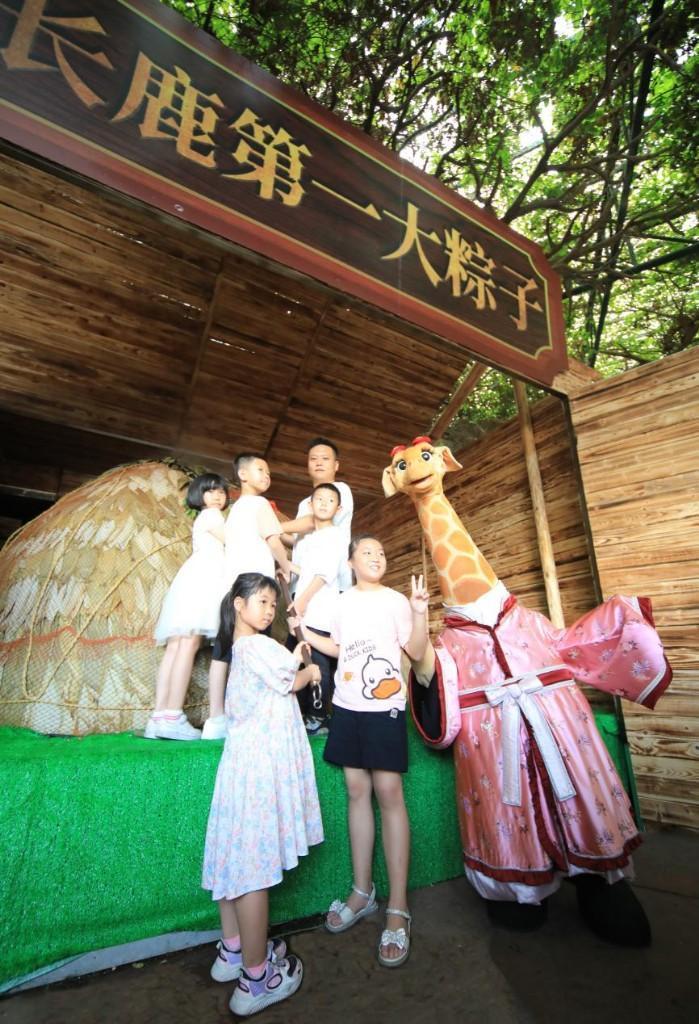 端午节期间,位于佛山顺德的长鹿旅游休博园推出“民俗端午节”活动,还为游客推出了端午节活动的“美食担当”——高近3米、长近4米、重达3.8吨的端午大粽子。据长鹿厨师代表介绍,“大粽子”是由长鹿十几位大厨耗时80多个小时制作出来的心血“结晶”。除此之外,还需要蒸煮50多小时才能把这个大粽子蒸熟。粽子用料十足,其中糯米和猪肉就有1300多公斤,里面还有咸蛋黄、冬菇、红豆、花生等各式食材,都是300公斤起步。