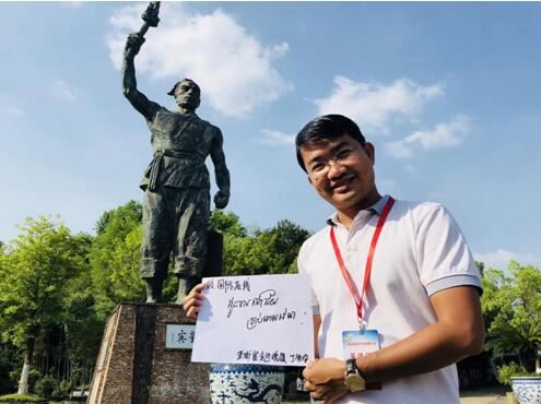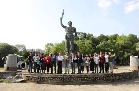 The team of foreign reporters poses for photo in front of the bronze statue—Tongbin, the god of the kiln in Jingde Town.