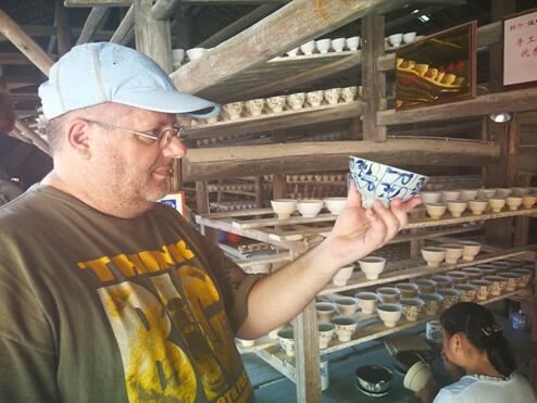 German journalist Nils Bergemann films the porcelain manufacturing process at the Jingdezhen Ceramic Folk Museum.