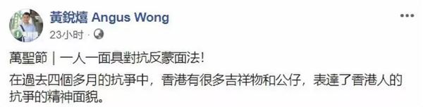 近日,黄锐熺在社交媒体以区议会选举广告为名,公布由其设计制造的万圣节面具设计图,打印在纸张上即为面具,鼓噪示威者头戴面具继续上街暴力示威。