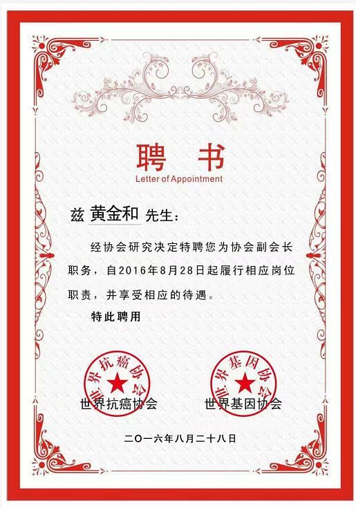 据记者了解,黄金和医生亦为国际同心会世界总会省市区联席委员会'常委',其夫人肖女士同时出任该会'执委',为将此济世良品推展至全世界,正不遗余力努力中。国际同心会总会长苏炳郎感念其夫妇至诚,拟检具其临床,委送IAE国际学士院世界健康医学审议会,做药性药理的分析评鉴及亚太临床实据征验的审议工序,俾点燃人类健康的明灯,莫令璀钻蒙尘,让黄医生半生奇遇精研的心血结晶,对世界人类做出更伟大的贡献 !