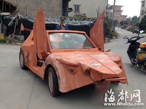 这辆自制红木跑车,车头为金蝉造型