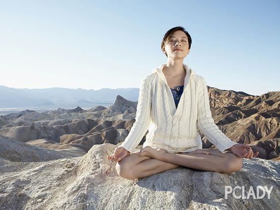 保持盘腿坐姿,双手合十置于胸前,吸气,慢慢向后仰头,感觉到颈部线条向后的尽量延伸,保持5秒后,呼气,慢慢向前垂头,闭上双眼。