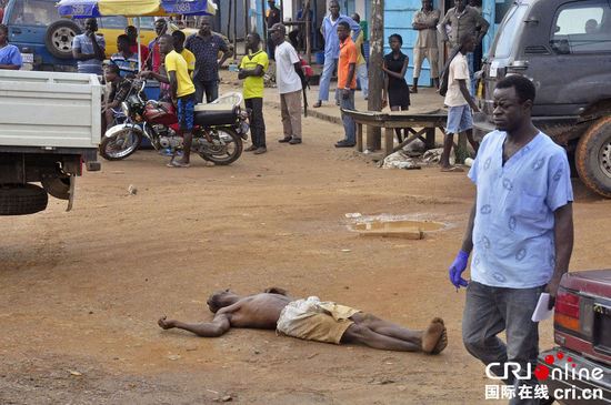 当地时间2014年9月4日,利比里亚蒙罗维亚,街头一具因感染埃博拉而死亡男性患者尸体。正当西非国家正在努力遏制史上最严重的埃博拉疫情时,一些专家提出了一种不同寻常却又简单的治疗方法,即埃博拉康复者的血液。仅将从埃博拉康复者体内提取的抗体注入患者体内而不用药。 图片来源:Abbas Dulleh/东方IC