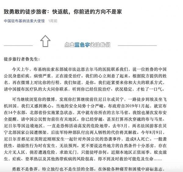 得知鲁佳斌在布基纳法索患上疟疾病情严重,中国驻布基纳法索大使馆发了一篇题为《致勇敢的徒步旅者:快返航,你前进的方向不是家》的文章。文中提到,大使馆得知鲁佳斌还打算继续穿越前往尼日尔或贝宁,感到非常揪心。中国驻布基纳法索大使馆表示,因为当地安全局势十分严峻,鲁佳斌已经穿越、甚至打算再次穿越的布与马里、尼日尔等国边境地区,一直是恐怖活动高发的危险地带。这两年已发生过多起针对外国公民的空袭事件。
