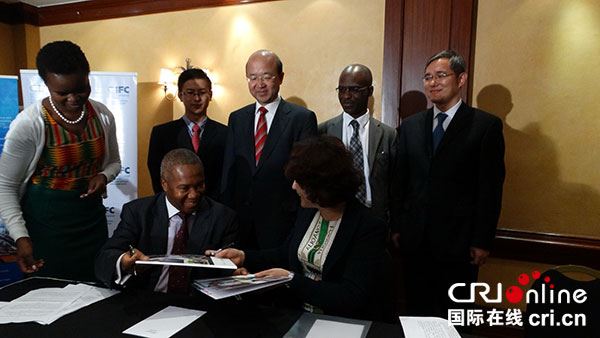 中信建设董事长洪波(前右)与国际金融公司东部和南部非洲区域主任奥马尔・赛耶蒂(前左)签署合作协议。 (摄影 王新俊)