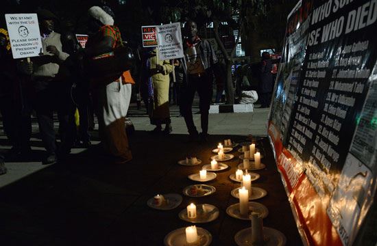 当地时间7月23日,美国总统奥巴马到访的前一天,肯尼亚内罗毕民众为1998年8月7日美国驻肯尼亚大使馆爆炸受害者举行烛光守夜活动,要求美国政府赔偿。那次爆炸事件造成超过200人死亡。CFP供图