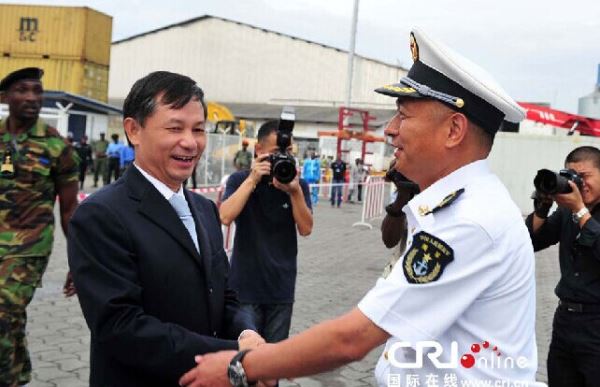 中国驻喀大使沃瑞棣在码头欢迎编队到访(李晓摄影)