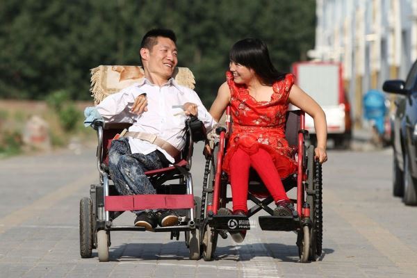 河北廊坊,一个是一级残疾,只有头部和右手大拇指能动;一个是二级残疾,一场车祸导致娇俏可人的她双腿无知觉。一次偶然的聊天,让两人互生爱慕。近三年的时间,他们冲破阻碍,终于在今年5月4日举行了婚礼,成就了一场轮椅上的爱情。图为5月20日,夫妇俩在公园里晒太阳。(CFP/史晟全)