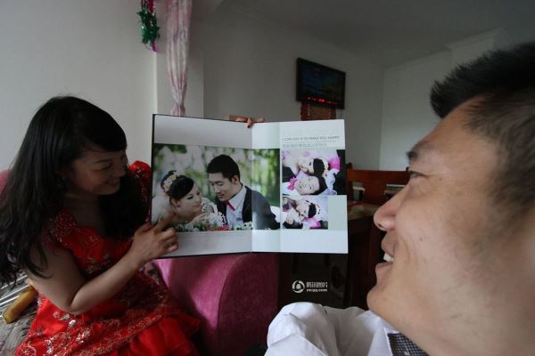 一起欣赏婚纱照是俩人平时最幸福的时刻。