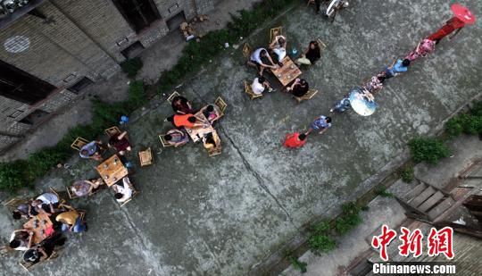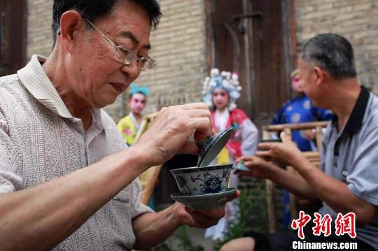 身着旗袍的女士围坐粮站前,品尝当地盖碗茶。刘杰 摄