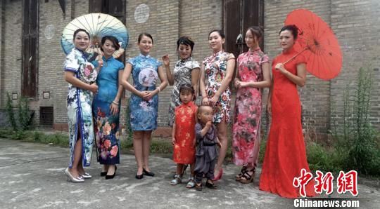 身着旗袍的女士带着孩子在粮站前合影。刘杰 摄