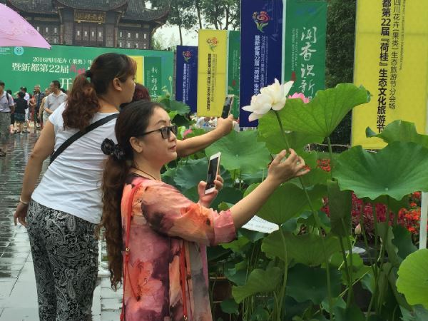 中新四川网7月6日电 (汤雁刘刚)“六月荷花荡,乐土桂蕊香”7月6日,2016四川花卉(果类)生态旅游节分会场暨新都第22届荷桂生态旅游节在新都区桂湖公园的红莲碧叶中正式拉开序幕。近千名游客来到现场,体验新都荷花别样红的美丽风光。