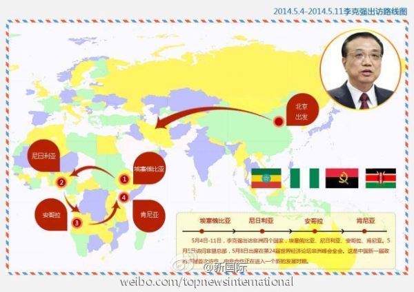 4日起至5月11日,国务院总理李克强出访非洲四国和非盟总部,这是李克强今年首次出访,也是新一届政府总理首次访问非洲。