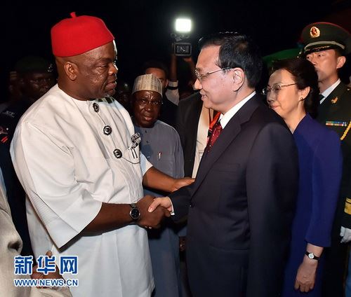 应尼日利亚总统乔纳森邀请,国务院总理李克强于当地时间2014年5月6日晚乘专机抵达阿布贾国际机场,开始对尼日利亚进行正式访问。李克强总理夫人程虹同机抵达。尼日利亚外交部长瓦利、劳工与生产力部长沃古、联邦首都区部长巴拉等到机场迎接。巴拉按照接待尊贵客人的传统礼仪,向李克强赠送了阿布贾城市钥匙,尼日利亚男女青年表演了热情的民族歌舞,热烈欢迎李克强夫妇到访。中国驻尼日利亚大使顾小杰也到机场迎接。