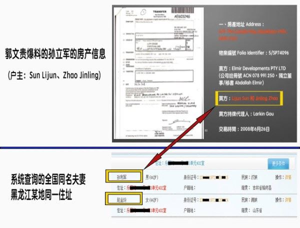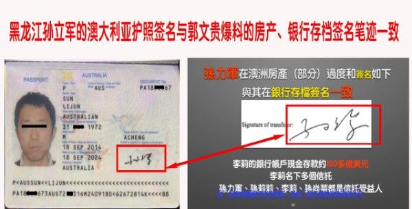 一、关于公安部领导孙力军房产签名真相。郭文贵在发“不”会上公布了孙力军在澳洲签名的图片,但签名写的是“孙立军”而不是“孙力军”,显然不是同一人。房产买方名字为Lijun Sun和Jinling Zhao,他们是夫妻吗?通过朋友查了下,符合情况的有对黑龙江哈尔滨的孙立军(又名孙利军)和赵金玲夫妻,后移民到澳洲。这一切难道都是巧合?当看到这个孙立军护照签名后,一切都真相大白了,原来他才是郭文贵公布的财产拥有者,跟公安部的孙力军没有一分钱的关系。有图有真相: